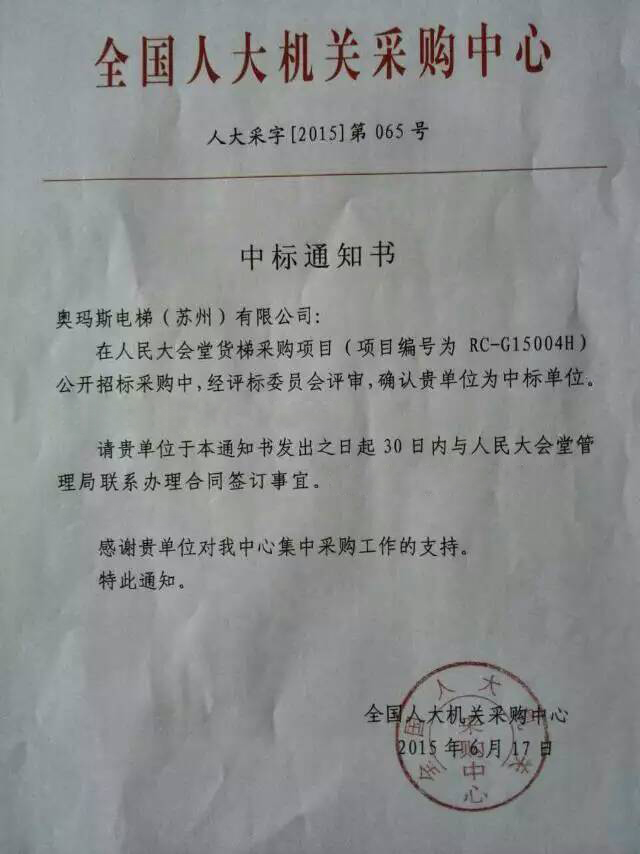 2015年6月17日,對(duì)于奧瑪斯電梯公司而言這是一個(gè)鼓舞人心的好日子。我們從全國(guó)人大機(jī)關(guān)采購(gòu)中心獲得最終確認(rèn)信息:奧瑪斯電梯(蘇州)有限公司在北京人民大會(huì)堂1臺(tái)4000KG,1.0M/S,5層站載貨電梯(項(xiàng)目編號(hào)為:RC-G15004H)的公開(kāi)招投標(biāo)活動(dòng)中一舉獲勝,成功中標(biāo) (詳見(jiàn)”中標(biāo)通知書(shū)”) 。