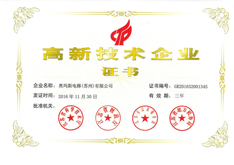 在殘酷的電梯市場競爭中,我司每年持續拿出資金用于新產品的研發及現有產品的持續優化改進,使得奧瑪斯的產品“性價比”更高,在我司的產品上保持了“人有我新、人無我有”的創新特色,贏得了廣大客戶的信任與好評。同時我司也十分注重技術成果的專利申請與保護工作。一系列的付出、持續的付出必將贏得回報,我們先后獲得了“江蘇省高新技術企業”、“江蘇省科技型中小企業”等榮譽證書。