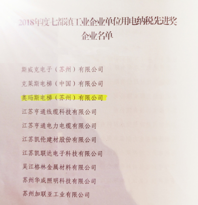 2019年2月14日,豬年初十,情人節。下午2:00時分,公司潘偉榮總經理從開會現場傳來喜訊:奧瑪斯電梯(蘇州)有限公司榮獲“2018年度吳江七都鎮單位用電納稅先進獎” (見下列獲獎名單及獎牌) 及“2018度年吳江七都鎮單位納稅百強企業”的殊榮。這種榮譽,奧瑪斯公司連續保持了4年。
