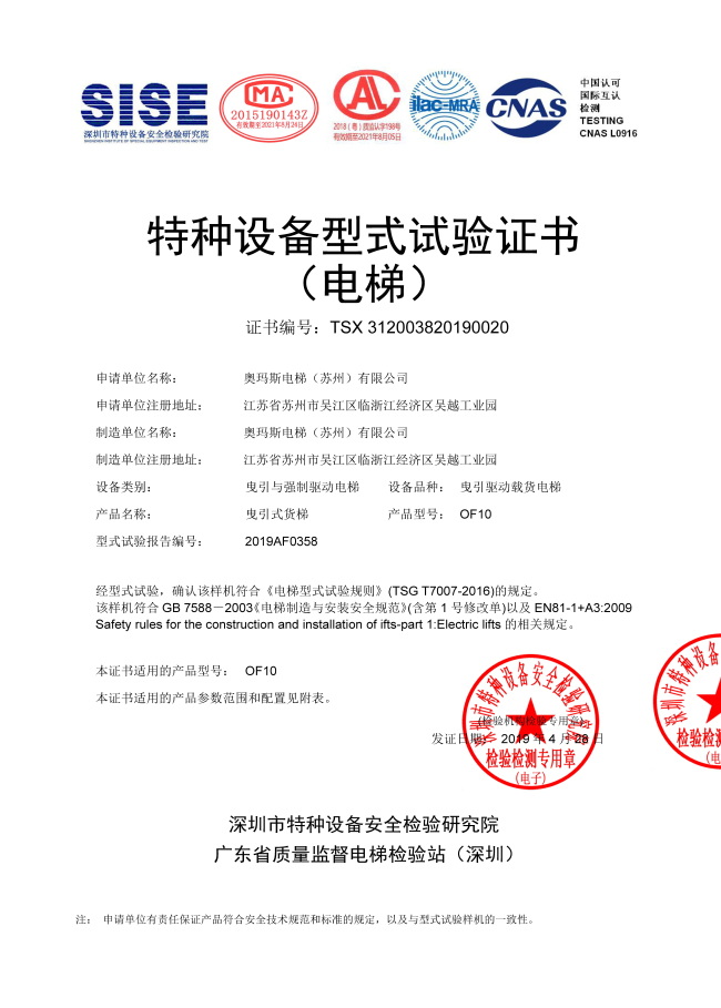 奧瑪斯歷經(jīng)半年的研發(fā)努力,我們?cè)诔V莸貐^(qū)試制完成21噸超大噸位載貨電梯樣梯的安裝與型式試驗(yàn)工作,其后順利通過(guò)上海交通大學(xué)電梯檢測(cè)中心的資料評(píng)審,終于如期在五月底前獲得新制造許可資格證書(shū)!